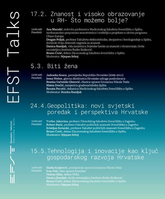 Kroz serijal EFST Talks Ekonomski fakultet želi postati mjesto otvorenog razgovora o pitanjima koja se tiču svih nas – od obrazovanja i znanosti, preko geopolitike, do tehnološkog napretka i inovacija. Serijal okuplja istaknute predstavnike znanosti, politike, gospodarstva i javnog života Republike Hrvatske, a namijenjen je studentima, nastavnicima, zaposlenicima Sveučilišta te široj zainteresiranoj javnosti.