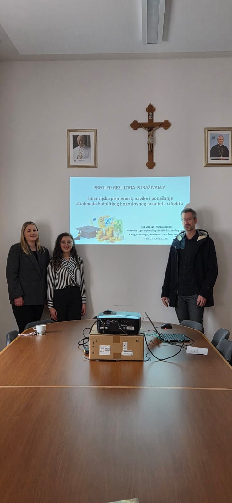 Radionica je realizirana u okviru Katedre Filozofije i kolegija Sociologija, a u njezinu je prvom dijelu predstavljeno empirijsko istraživanje o financijskoj pismenosti, navikama i ponašanju studenata KBF-a u Splitu. Istraživanje su, pod mentorstvom nastavnice sociologije Doris Žuro provele studentice prve godine diplomskog teološko-katehetskog studija Ana Vrdoljak i Mihaela Ezgeta.