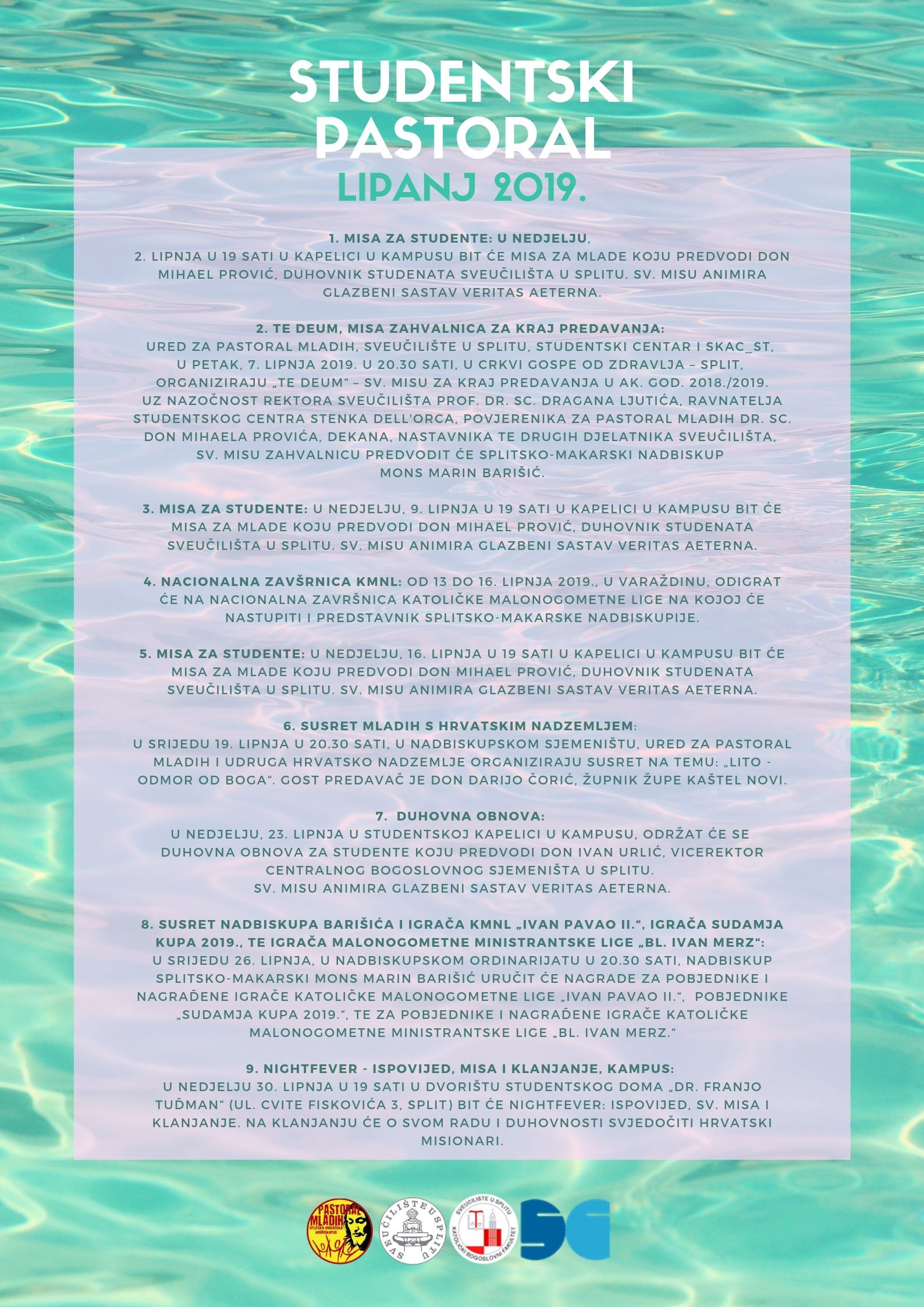 - MISA ZA STUDENTE: U nedjelju, 16. lipnja u 19 sati u kapelici u Kampusu bit će Misa za mlade koju predvodi don Mihael Prović, duhovnik studenata Sveučilišta u Splitu. Sv. misu animira glazbeni sastav Veritas aeterna.
