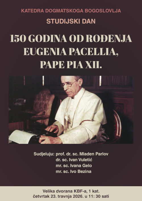 Studijski dan Katedre dogmatskog bogoslovlja "150 godina od rođenja Eugenia Pacellia, pape Pia XII" održat će se u Velikoj dvorani KBF-a, 1.kat u četvrtak 23. travnja 2026. u 11:30 sati.